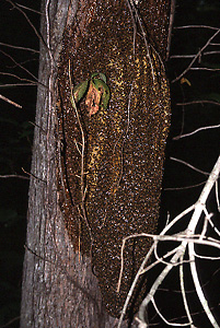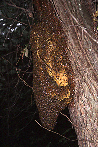 | The Honey Bee is found throughout North America and the rest of the world. Thought to originate in Africa, this very beneficial insect has been transported all around the world. Besides producing honey and beeswax, honey bees are very efficient pollinators. Most honey bees in the US nest in man-made boxes or hollow trees. If their nest is disturbed, the bees will form a swarm, and may nest on the side of a tree or other object if a more suitable site is not found. |